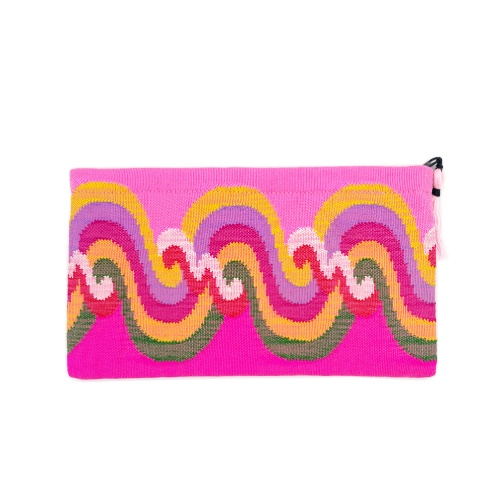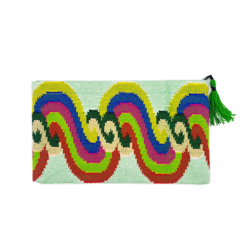 複雑で大胆な色柄のポーチはモダンな装いのアクセントに。