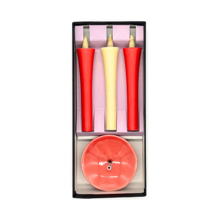 縁起のいい紅白のろうそくと九谷焼ろうそく立てのセットです。