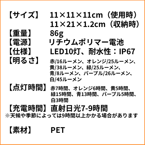 連続点灯時間は(弱)約72時間、(中)約42時間、(強)約10時間です。